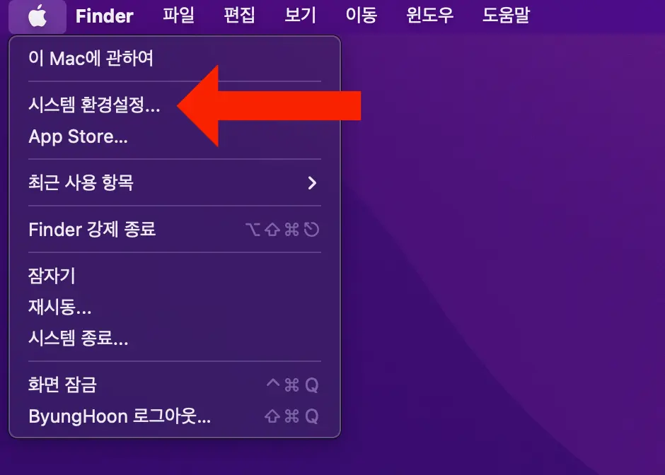 화면 왼쪽 위에 있는 사과아이콘 -> '시스템 환경설정'을 누릅니다.